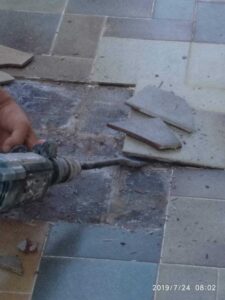 Εκτέλεση εργασιών αποξήλωσης πλακιδίων για την εφαρμογή στεγανοποιητικού κονιάματος σε 2 στρώσεις με ακολουθία την επικόλληση νέων πλακιδίων με ελαστική ριτινούχα κόλλα.